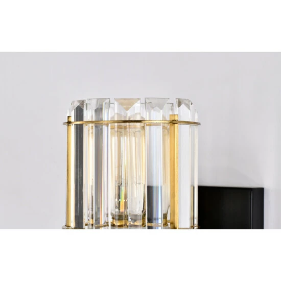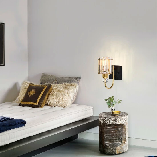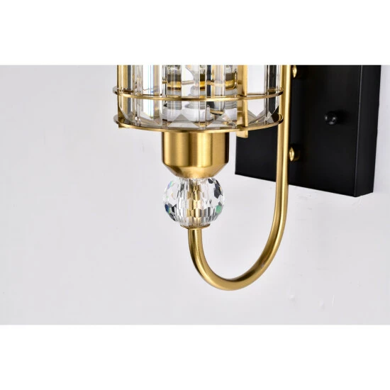 This wall sconce lets you brighten the look of any space with a touch of modern style. The fixture features a distinctive two-toned finish with a vintage black square backplate and hardware plus warm brass hues. Its slender arms contribute to the design’s open, airy feel, while the clear cylindrical crystal shades complete the look and help reflect this luminary’s light throughout the room.