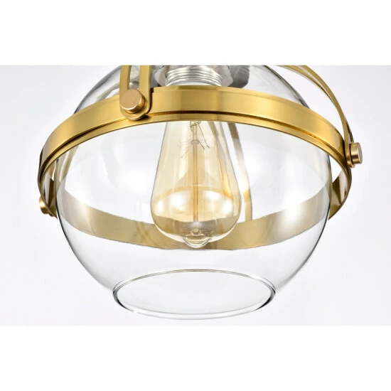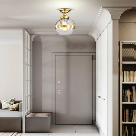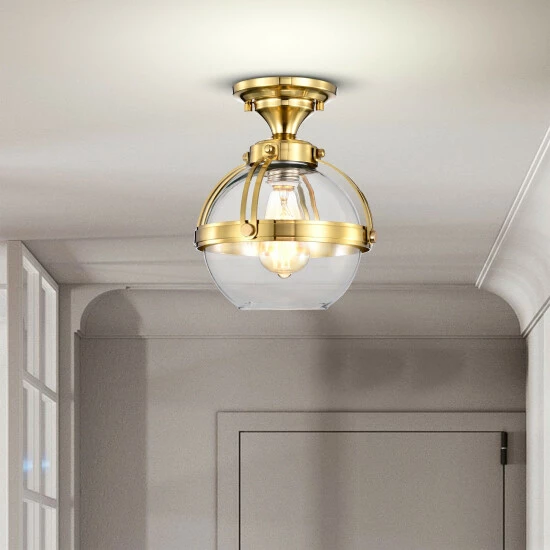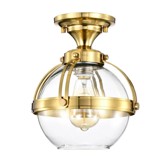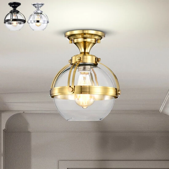 This single-light semi-flush mount is a smart way to add illumination and clean style to your space. It’s made from metal and hangs from a circular canopy. Metal bands bisect the clear glass shade and help to hold it in place. The orb-shaped shade, which is open at the bottom to allow for more direct light and easy to replace.