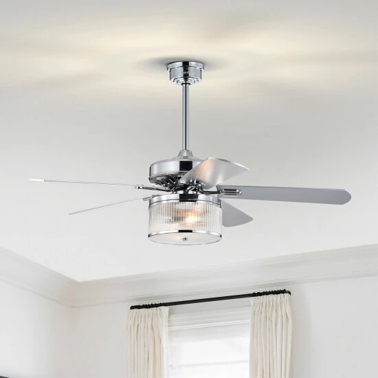 Clean modern line with integrated, this fan is the perfect choice for modern and contemporary room. Available in Chrome and Matte Black. Three-speed reversible motor, remote control included.