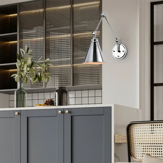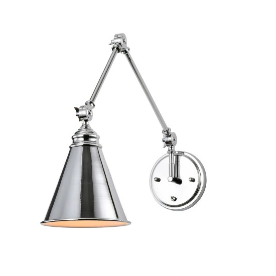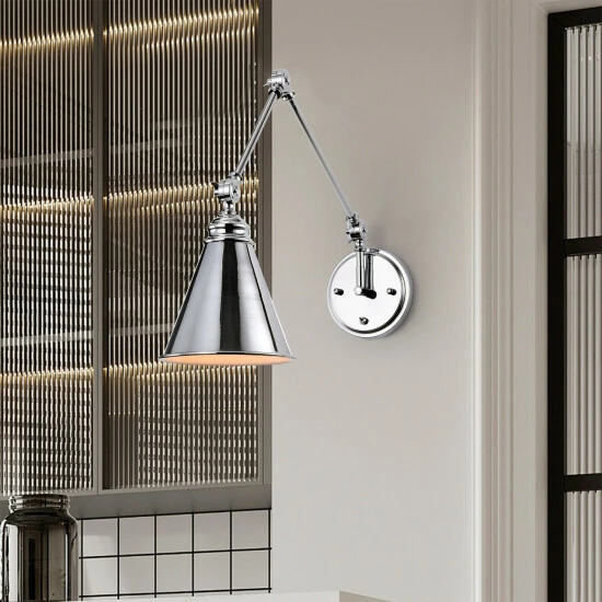 Swivel Arm wall mount lamp in chrome finish. Adjustable up to 90 degrees angle. Options of incandescent or LED bulbs (not Included). Great, charming and exquisite design for decorating ideas of a traditional home interior.