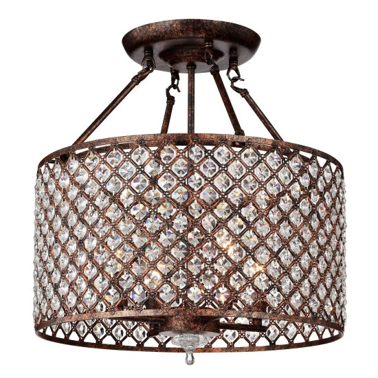 Highlight your kitchen with the delicate Estela Semi-Flushmount. Teardrop crystals hang from the sides and center of this piece and shine prisms of light when illuminated. The antique bronze frame contrasts the crystals with delicate lattice work that your guests will love.