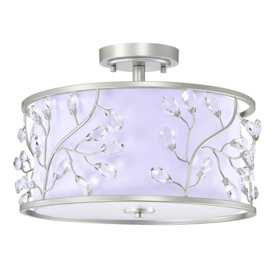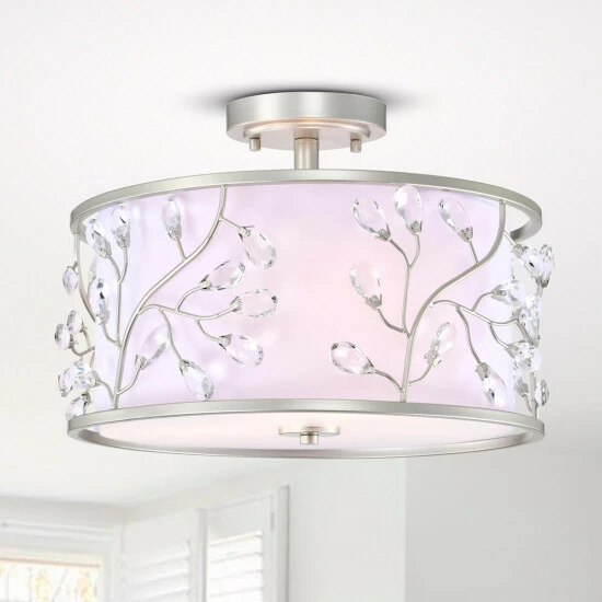 Light up your living room, bedroom, or entryway in style with this beautiful Crystal Semi Flush Mount Ceiling Light. Satin silver is finished with crystal for a sleek look. A frosted glass diffuser softens the glow of 3-light as they illuminate your ensemble. The fabric drum shade enhances the contemporary and traditional appeal.