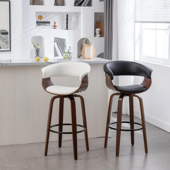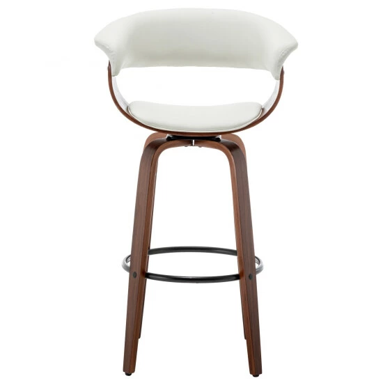 Mixed materials combine to create a stylish modern bar stool. The padded curved back wraps to the front for pefect height arm rests. A matching sturdy seat cushion adds to the overall comfort. Bent wooden legs and metal footrest ring complete the look.