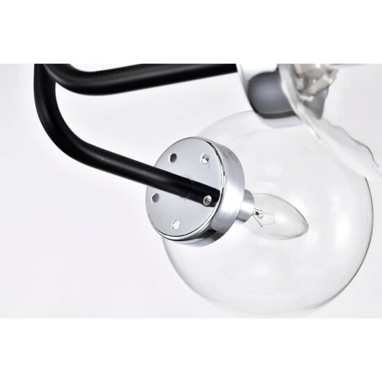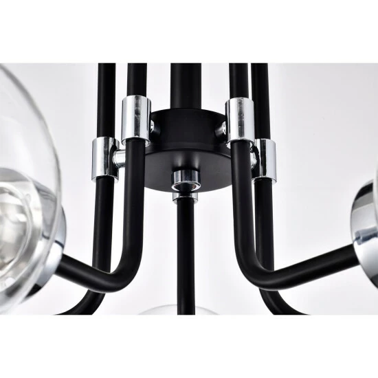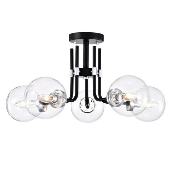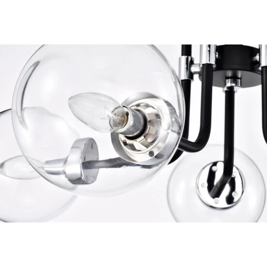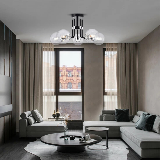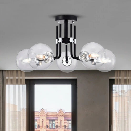 This semi-flush mount ceiling light features a sputnik shape with globe-clear glass shade. Its distinct silhouette breaks from a classic chandelier with its globe fabric shape design, adding a strong ambiance to your space. Available in both Silver and Gold.