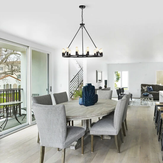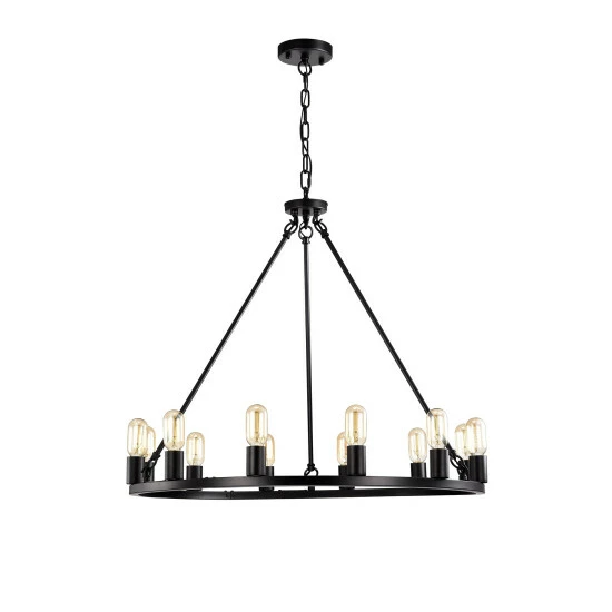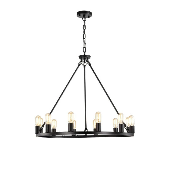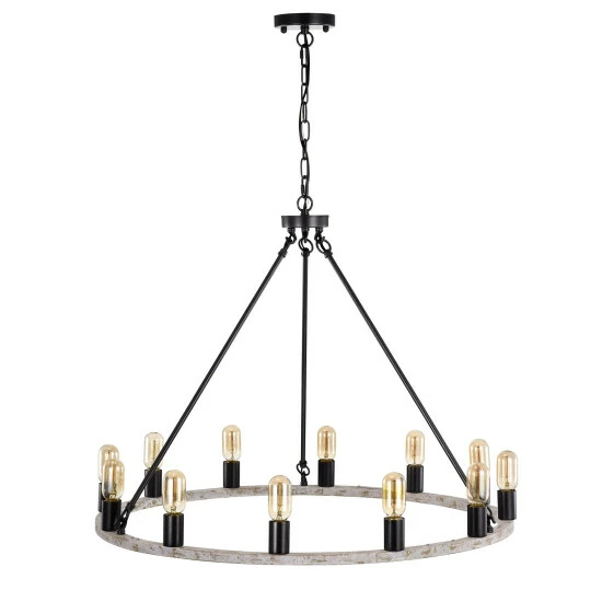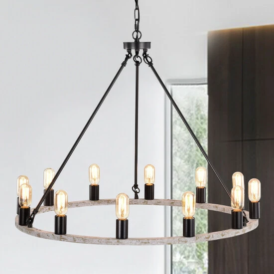 Add some grandeur and light into your home with this impressive and artful round wagon wheel chandelier. The solid metal wheel features twelve bulbs for a positively regal look perfect for illuminating any area. Choose an optional finish to best fit your space.