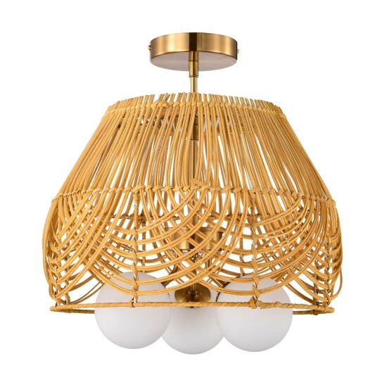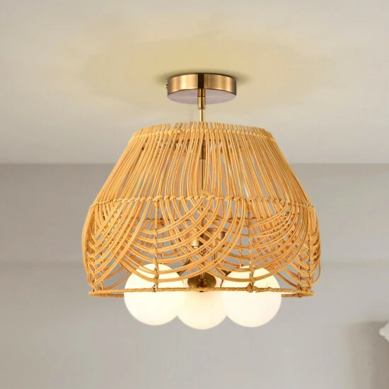 With its stylish dome-shaped silhouette and basket-like look, this 3-light flush mount features rattan at its very best. This hardwired fixture is made from metal brass finish and features a stylish natural look. Its low-profile design is ideal for standard or low ceiling entryways, dining rooms, or bedrooms.