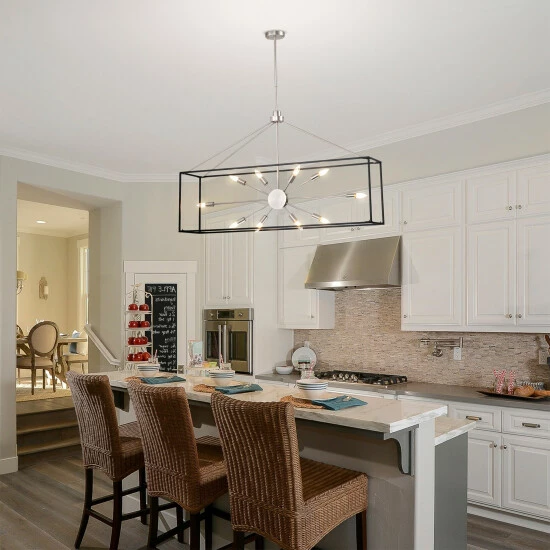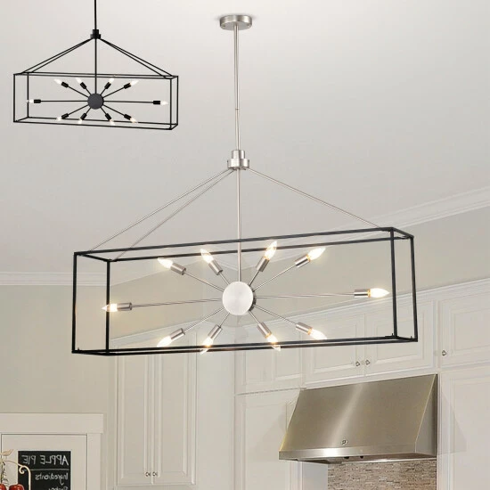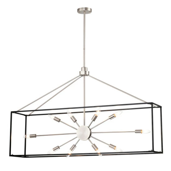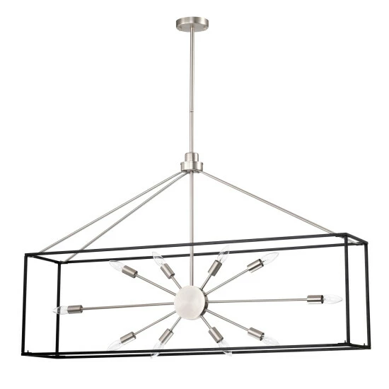 Create an eye-catching cluster above a kitchen Island or dining table without all the fuss. Perfect for adding an industrial inspiration to your space. Its distinct silhouette breaks from a traditional island chandelier with are a combination of satin silver and matte black metal finished. The open square frame allows the ten candle center lights to shine on!