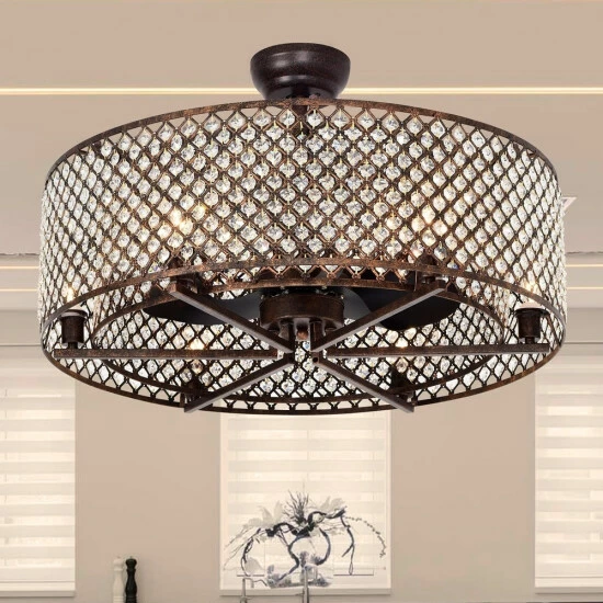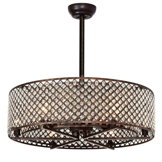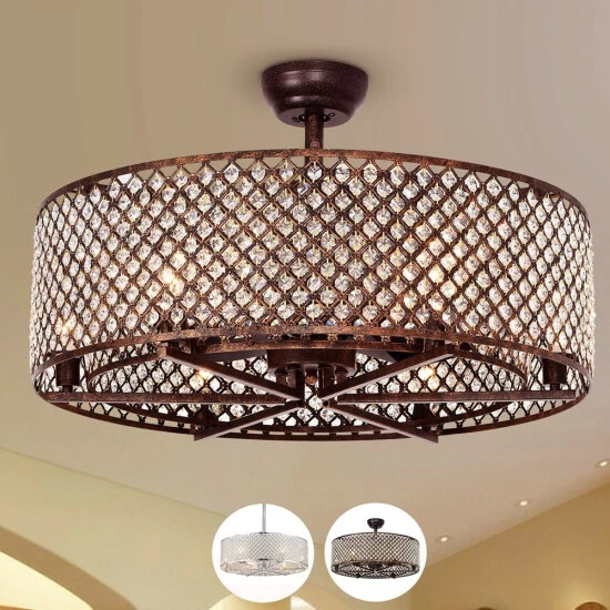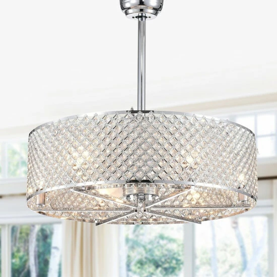 Lend glam sophistication to your space with this beautiful ceiling fan chandelier. The chandelier features a double drum shade, the metal lattice designs embedded with diamond-cut octagonal crystals to refract the glow from the six lights. Three internal scoop fan blades, controlled by remote, allow you to keep your room cool and comfortable, completing this beautiful design.
